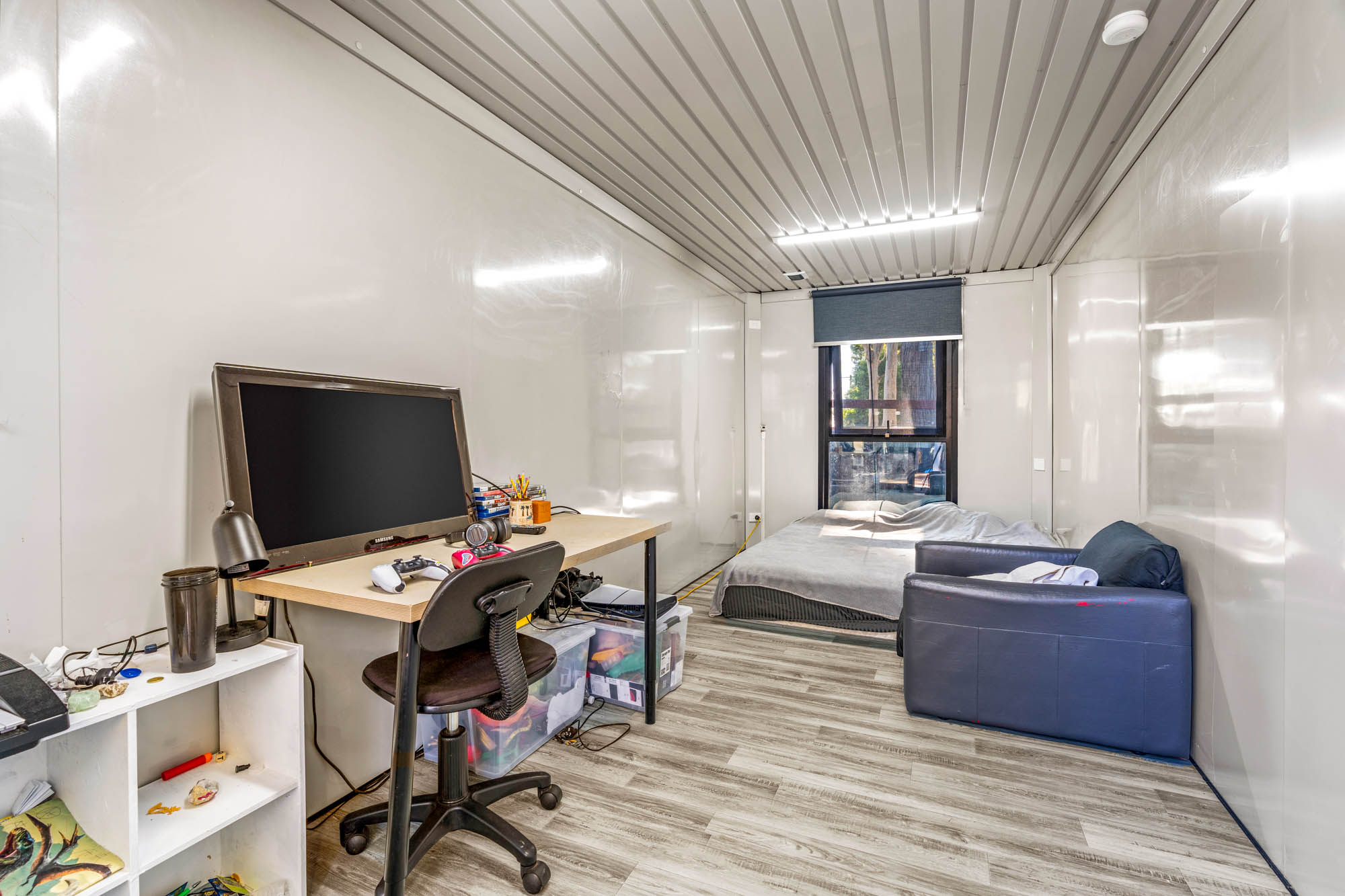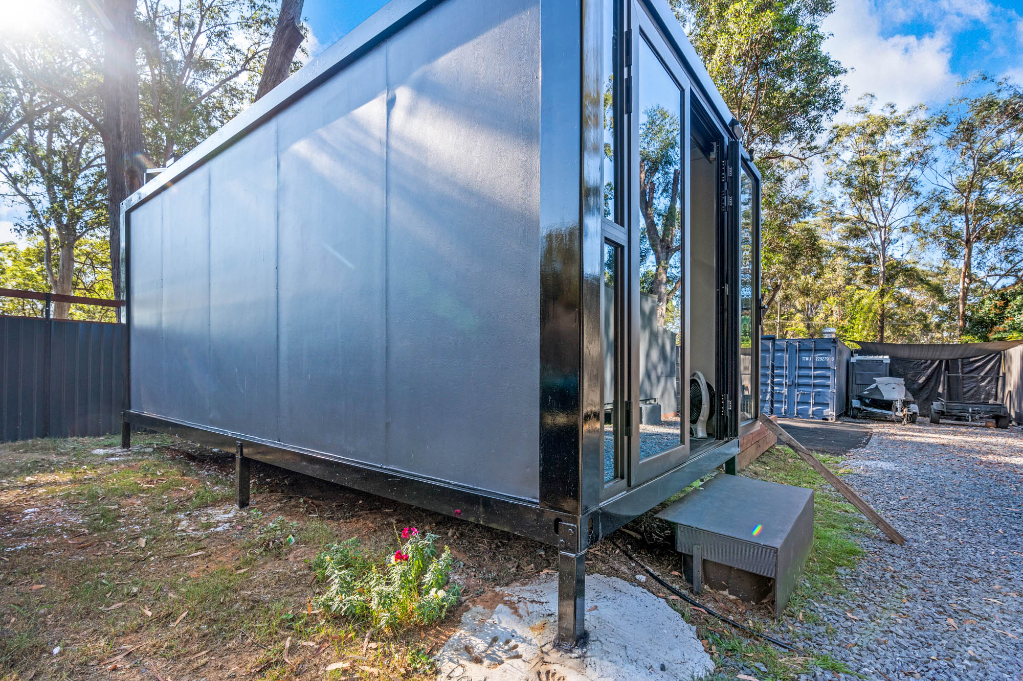 • Massive container home with floors, walls and ceiling, decked-out kitchen with cupboards, dining area AND bedroom; steel-framed and strong