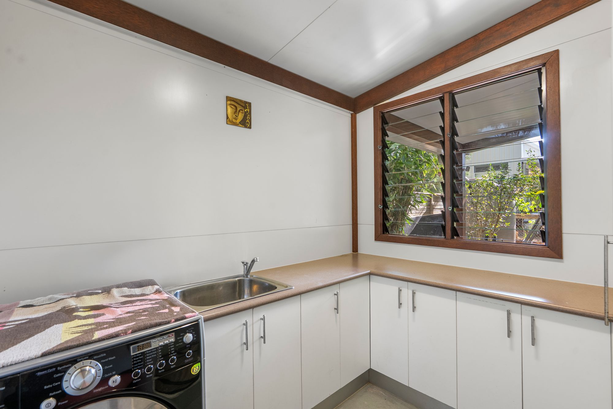 - Outdoor laundry with storage and bench space