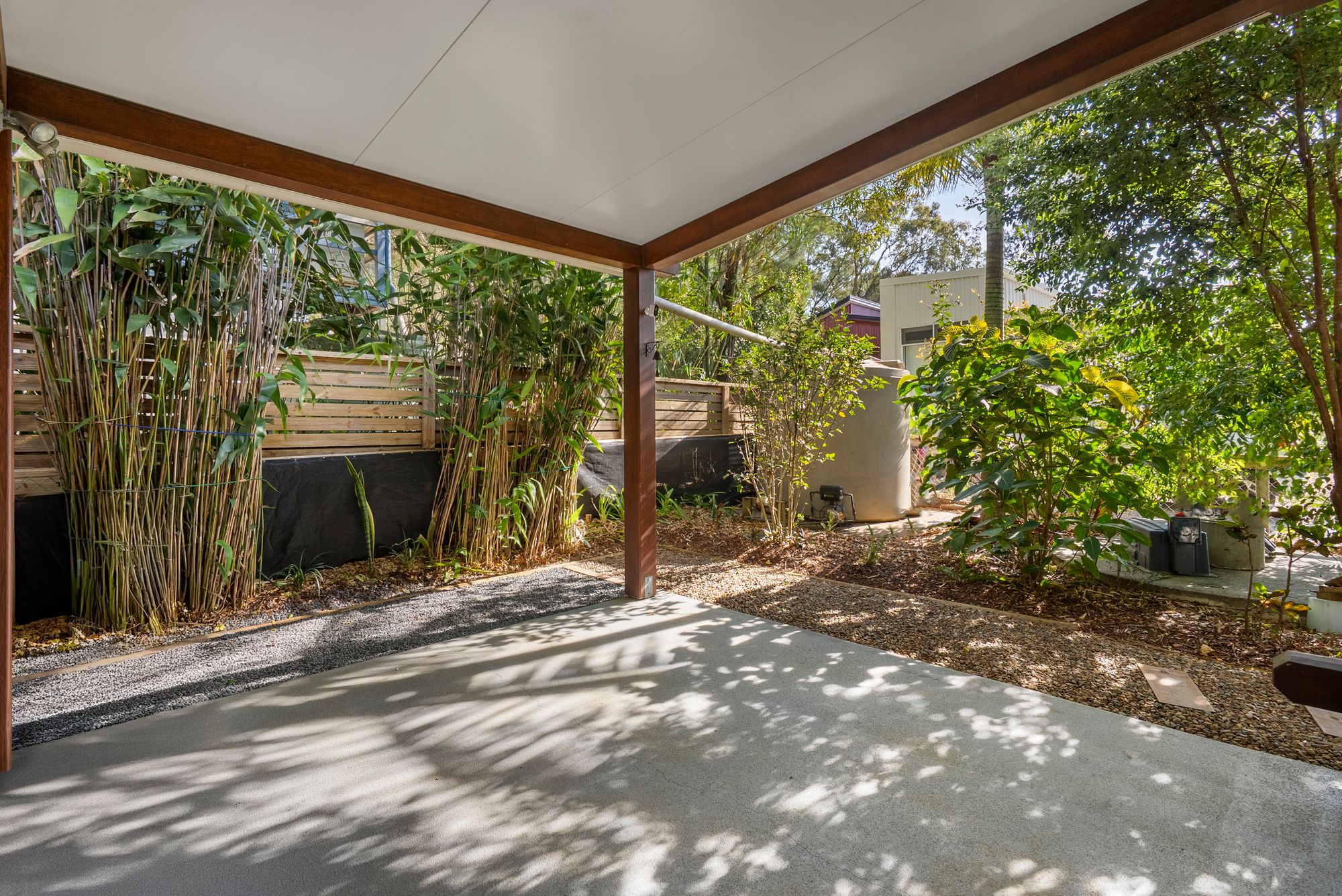 From the moment you arrive, this home feels like a private island retreat. A long driveway leads to a covered carport and ramp entry, creating an immediate sense of peace, seclusion, and space. The generous corner block ensures privacy from the street, while lush greenery frames the journey inside.