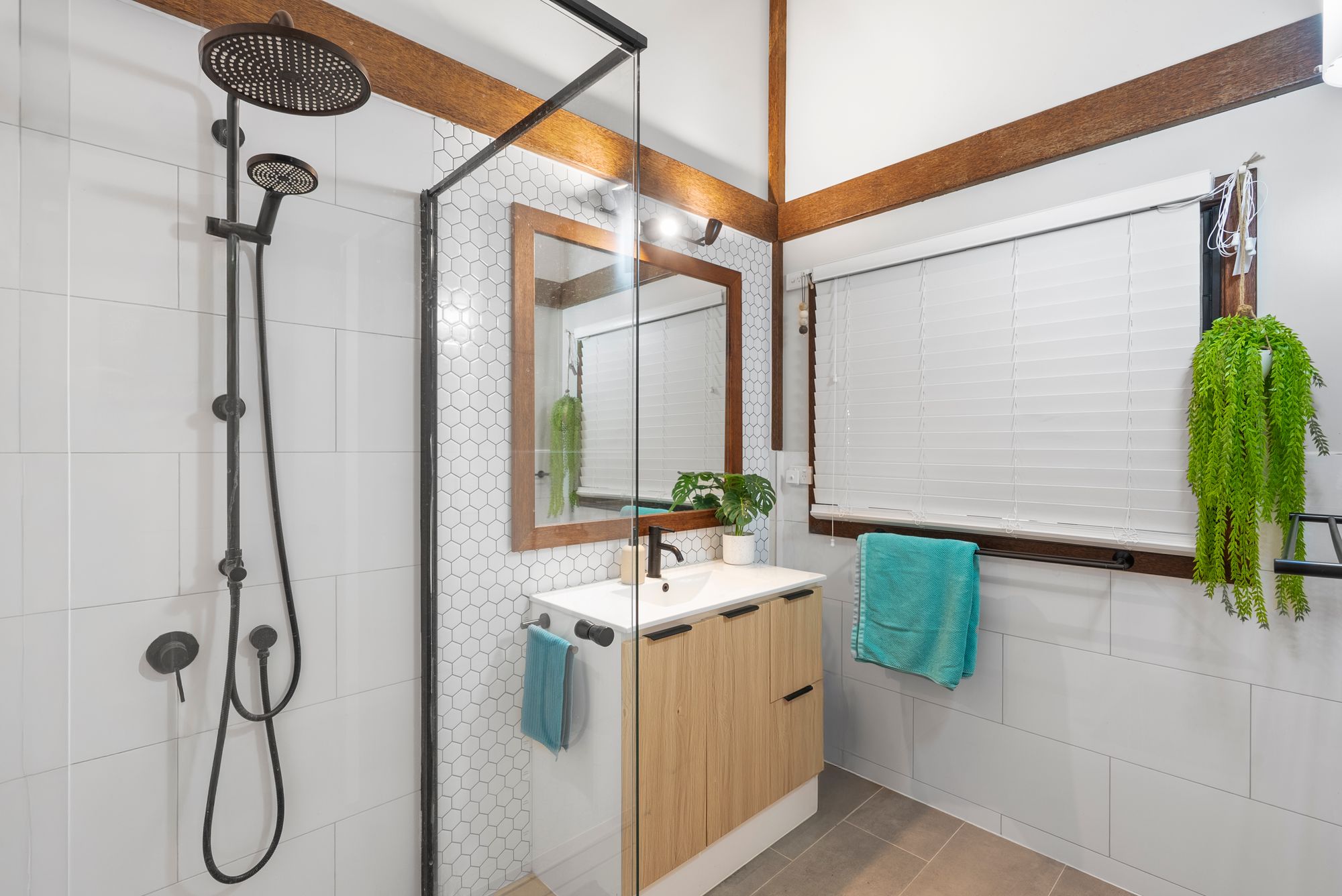 - Modern bathroom with black fittings + separate toilet with bidet